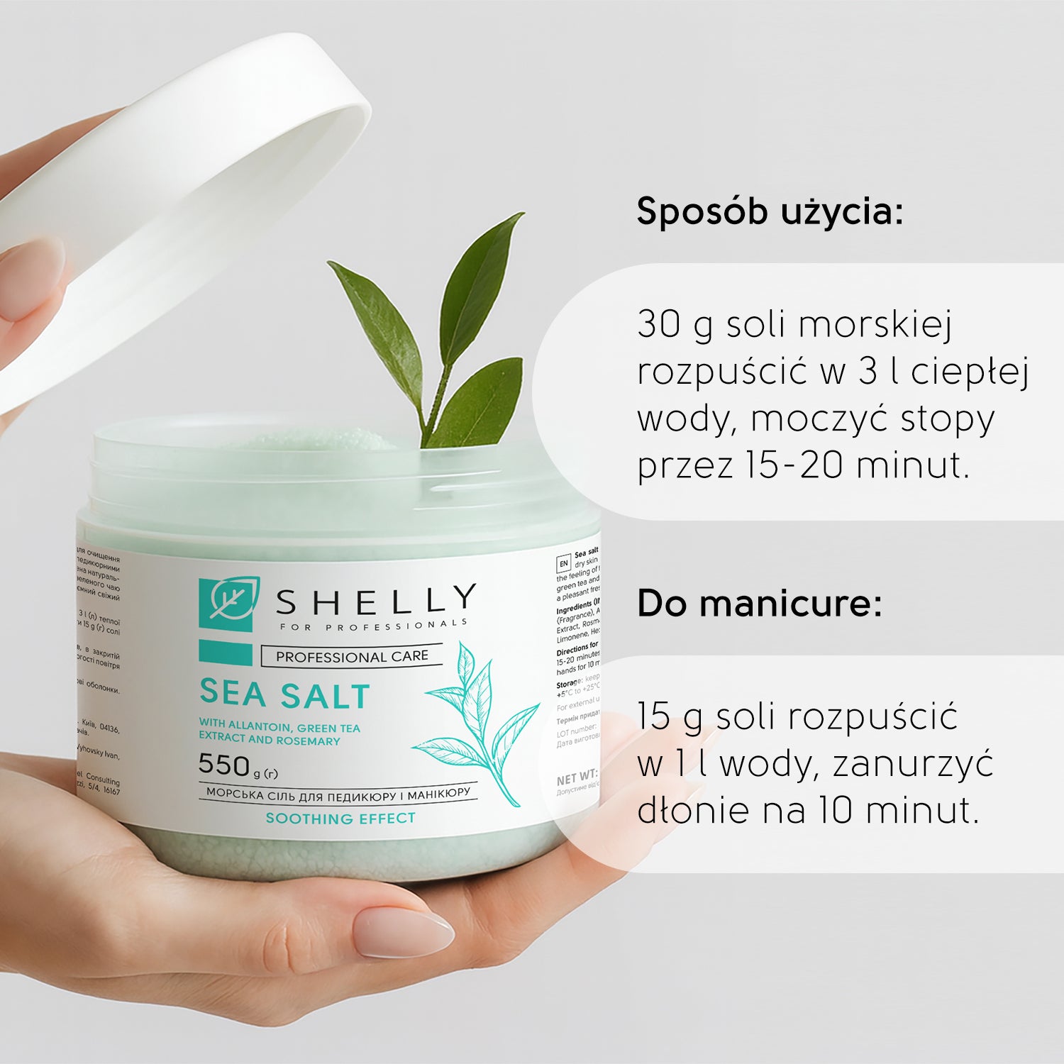 Rozpocznij manicure lub pedicure od relaksującej kąpieli z dodatkiem naturalnych soli, aby oczyścić i nawilżyć skórę dłoni oraz stóp. Wystarczy kilka minut w ciepłej wodzie z dodatkiem aktywnych naturalnych składników, aby złagodzić suchość i napięcie, doskonale przygotowując skórę do dalszych zabiegów. Formuła wzbogacona alantoiną delikatnie złuszcza, wspomaga regenerację naskórka i pomaga zwalczać zmęczenie. Ekstrakty z zielonej herbaty i rozmarynu dostarczają niezbędnych minerałów dla skóry i paznokci, zapewniając działanie przeciwzapalne i zmiękczające. Kąpiel z solą Shelly nie tylko poprawia stan skóry, ale także zapewnia przyjemne, relaksujące doznania .