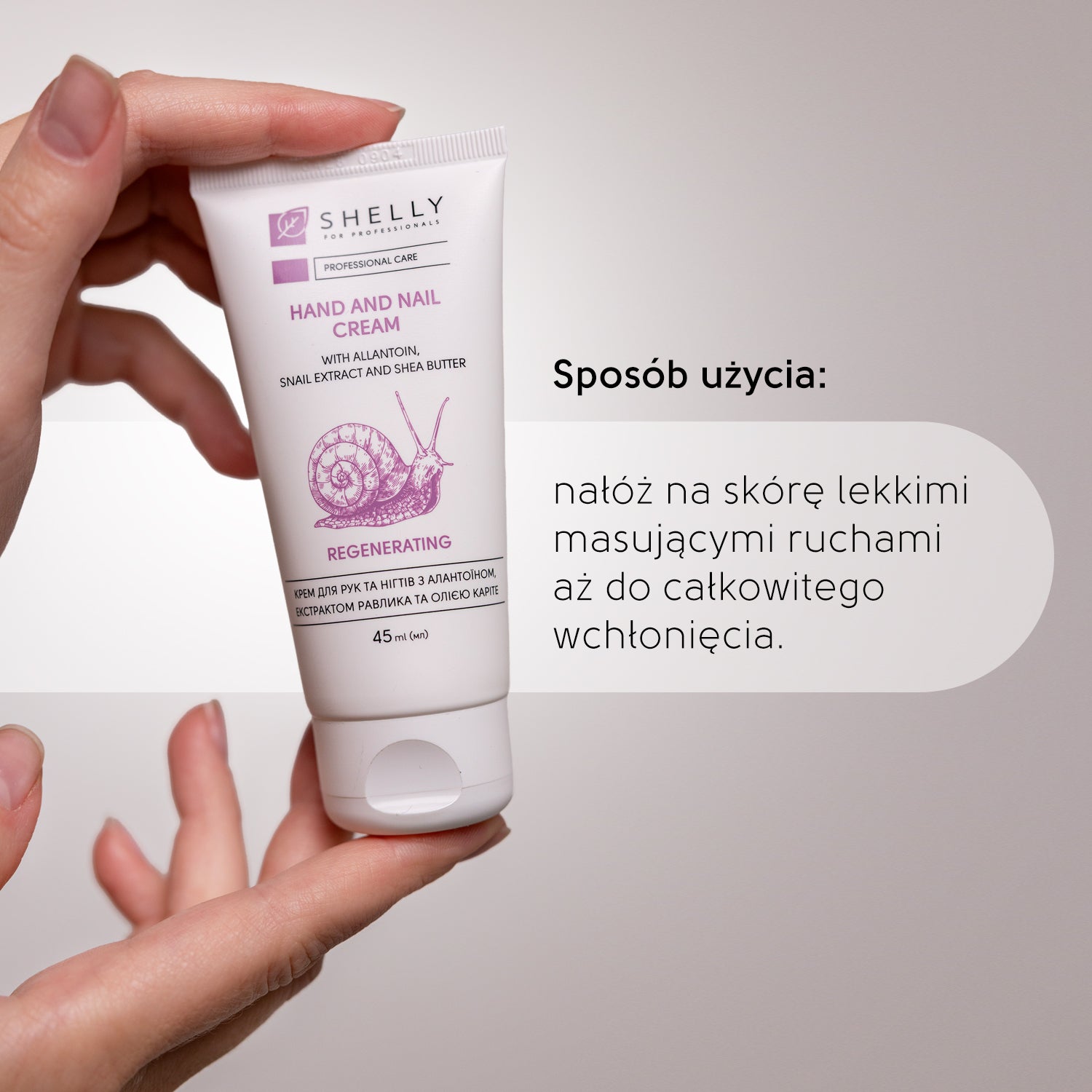 Shelly Hand & Nail Cream wzbogacony alantoiną, ekstraktem ze ślimaka i masłem shea, aby zapewnić intensywne nawilżenie, odżywienie i regenerację. Delikatna konsystencja szybko się wchłania, pozostawiając skórę miękką, aksamitną i odmłodzoną.
