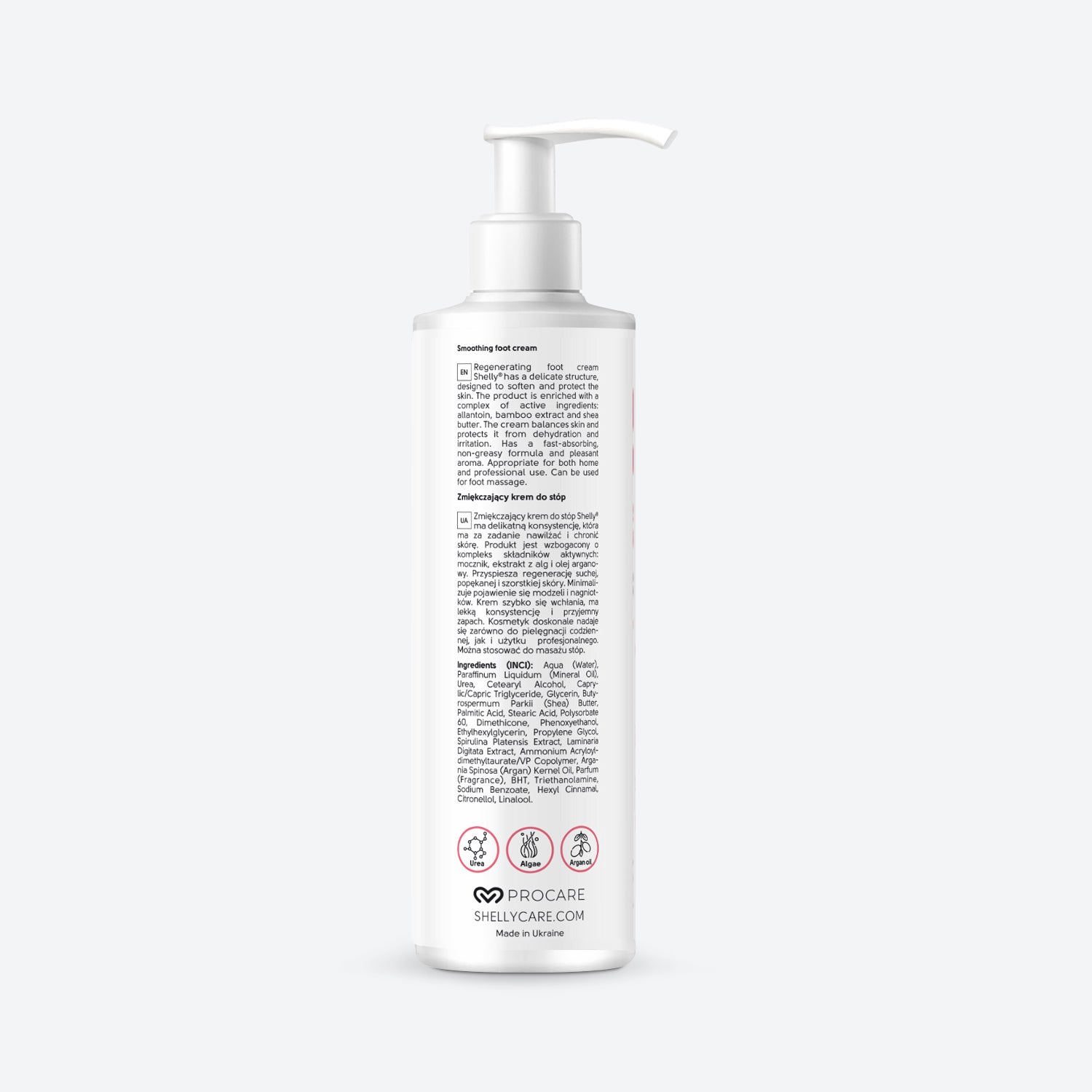 Крем для ніг Shelly Softening з сечовиною, екстрактом водоростей та олією аргани зволожує, відновлює та пом'якшує суху, шорстку шкіру, зменшуючи мозолі та тріщини. Ідеально підходить для щоденного догляду або масажних процедур.